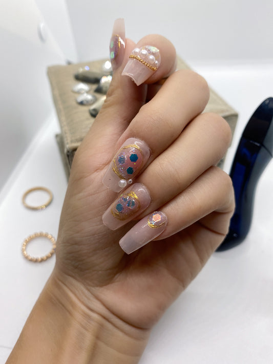 10 pcs luxury painted coffin fake press on nail pink mermaid nail Pearlescent