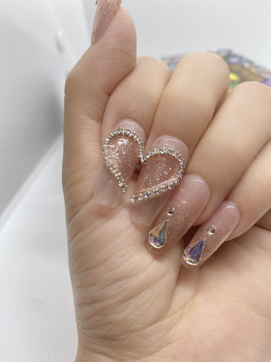 10 pcs customized hand painted coffin fake press on nail luxury flash heart style diamond crystal Rhinestones for party