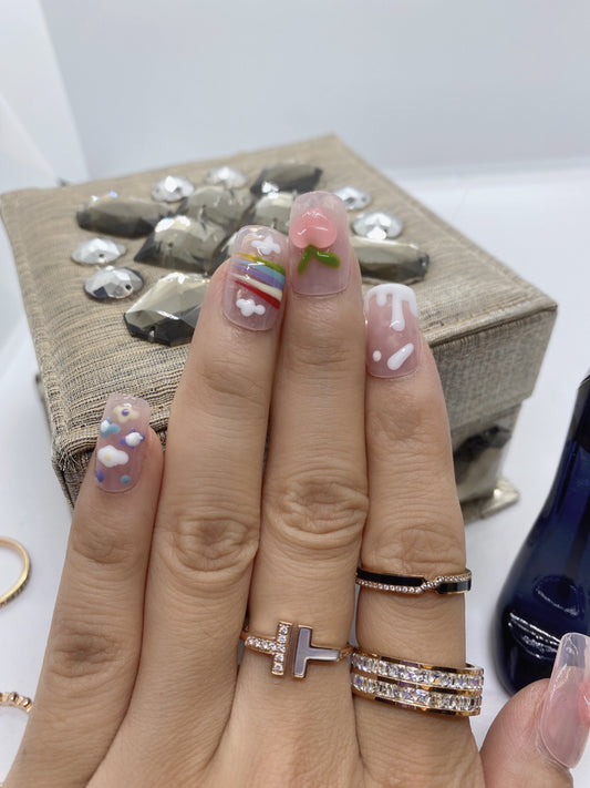 10 pcs customized fake coffin press on nail hand painted flesh pink adorable peach with rainbow for birthday