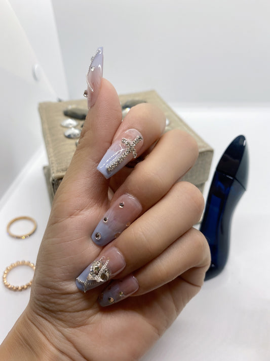 10 pcs luxury Gradient light blue coffin fake press on nail customized nail flash diamond cross Rhinestones